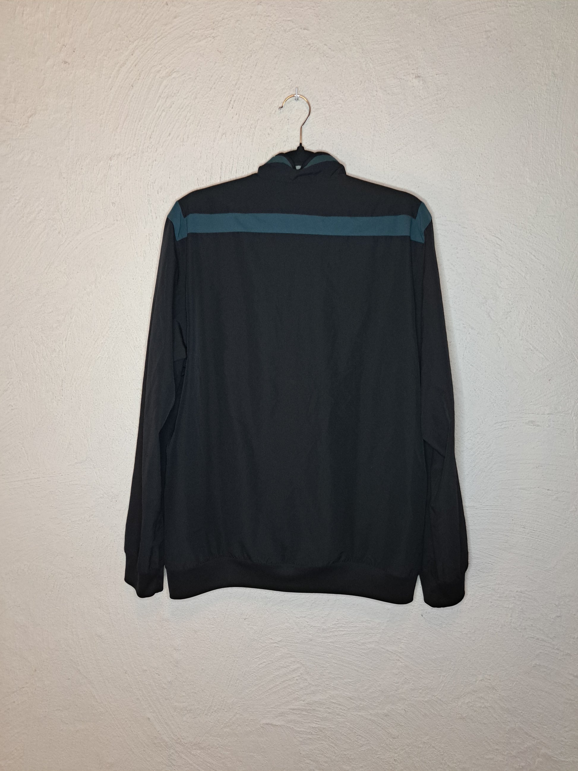 Dark Ajax training jacket by Adidas with a full zip, teal stripes on the sleeves, and an orange club crest with three stars on the chest.
