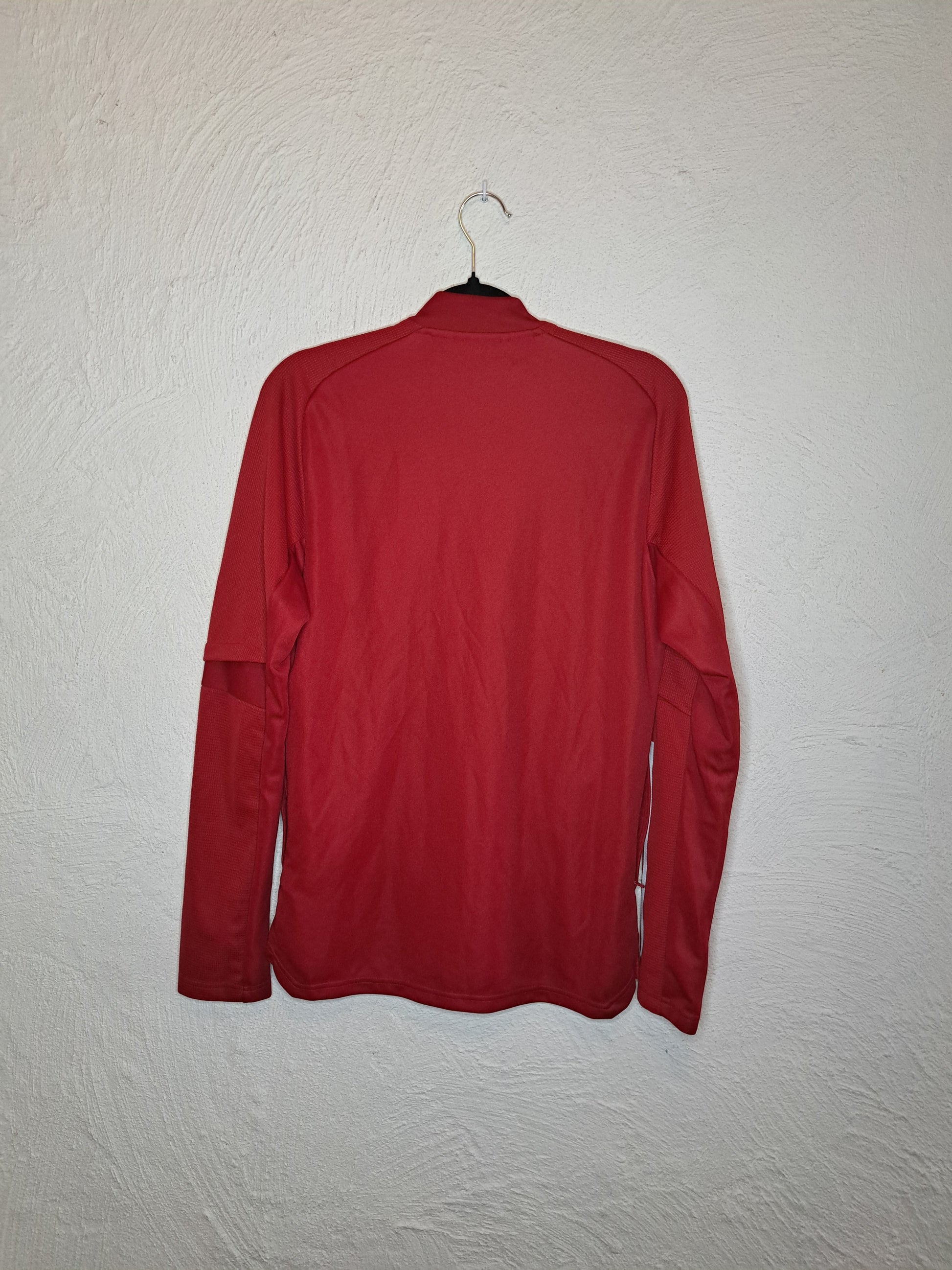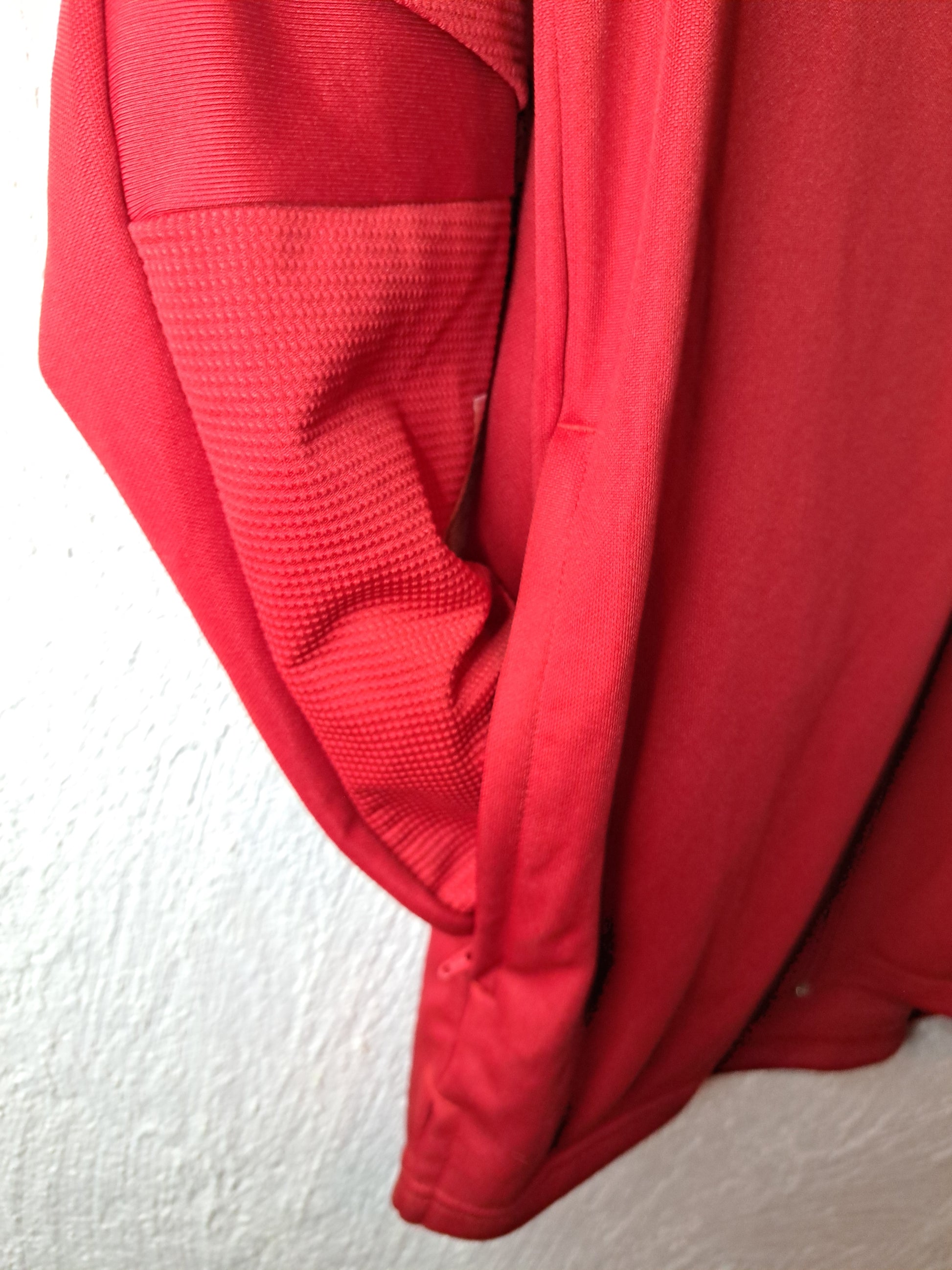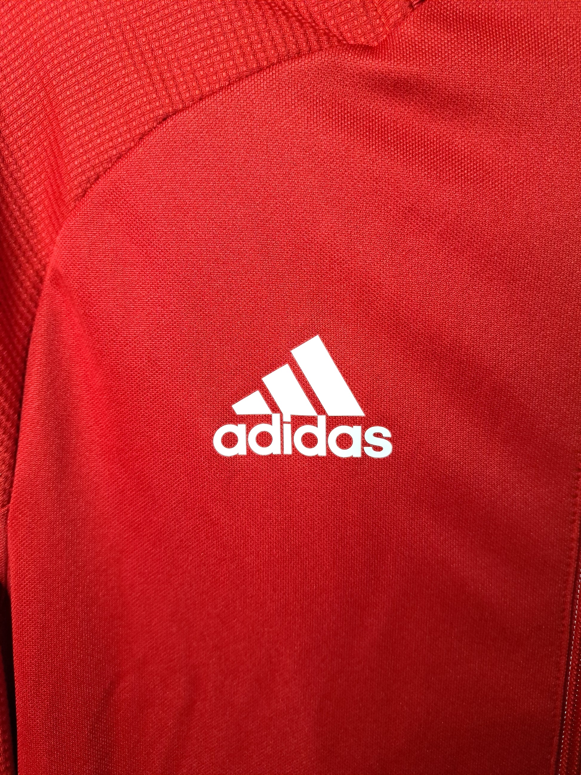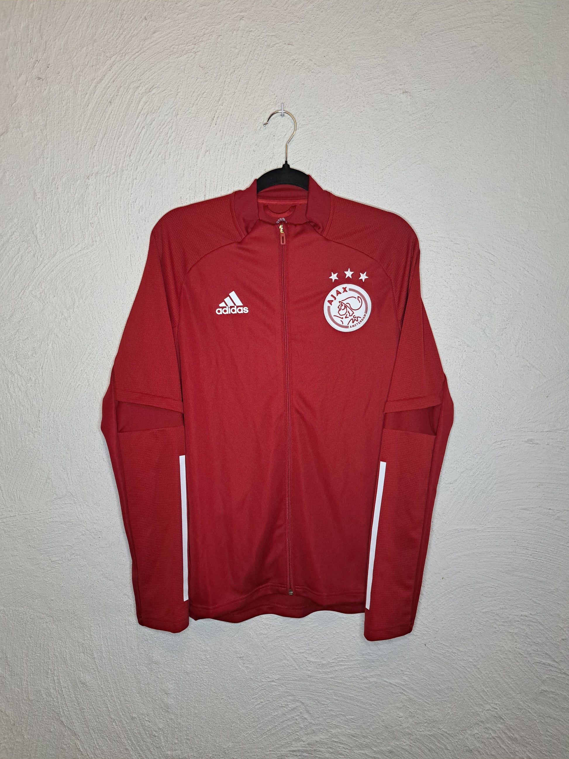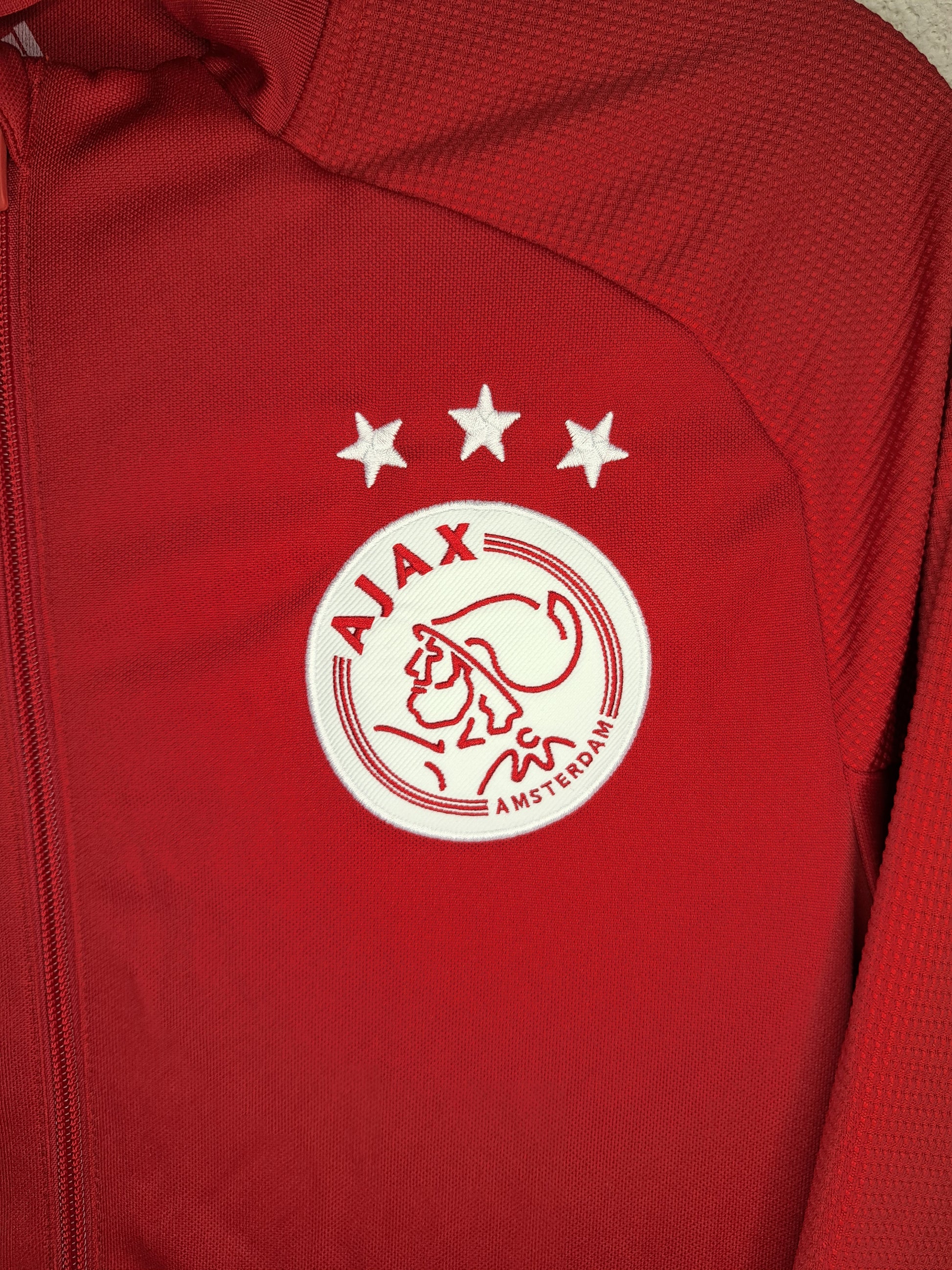 Red Ajax training jacket by Adidas with a full zip, white detailing on the sleeves, and a white club crest with three stars on the chest.