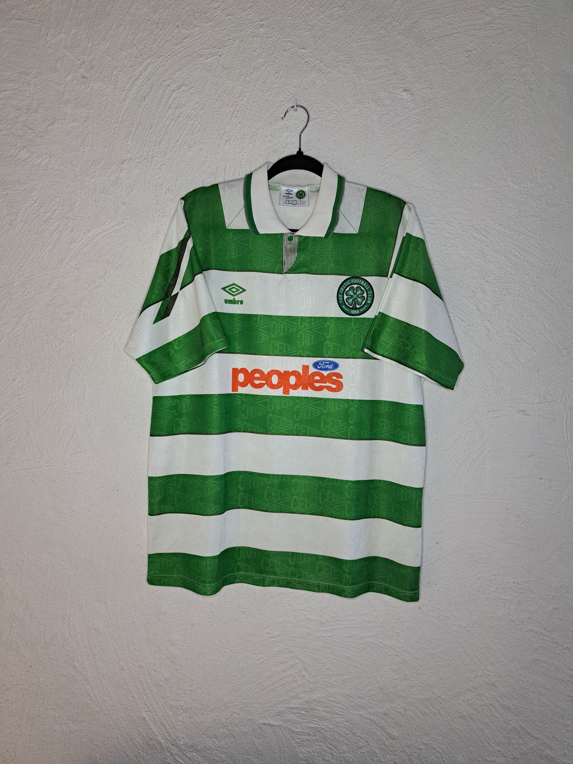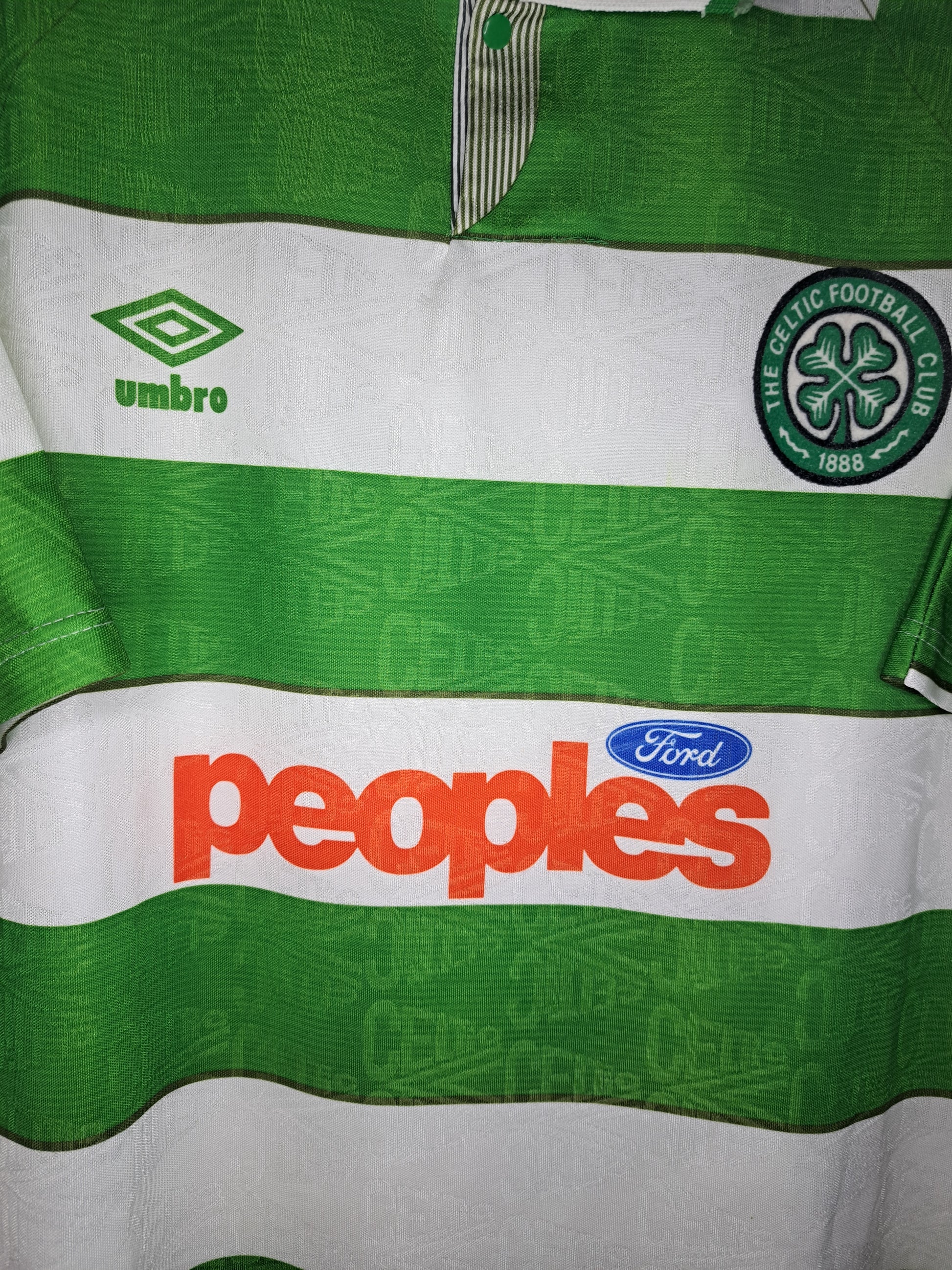 The Celtic 1991-1992 home shirt brings back the bold green and white hoops with a sharp collar and classic early-'90s vibe. Featuring the short-lived People’s Ford sponsor, it’s a rare throwback to a transitional era at Parkhead, pure vintage charm with unmistakable Celtic identity