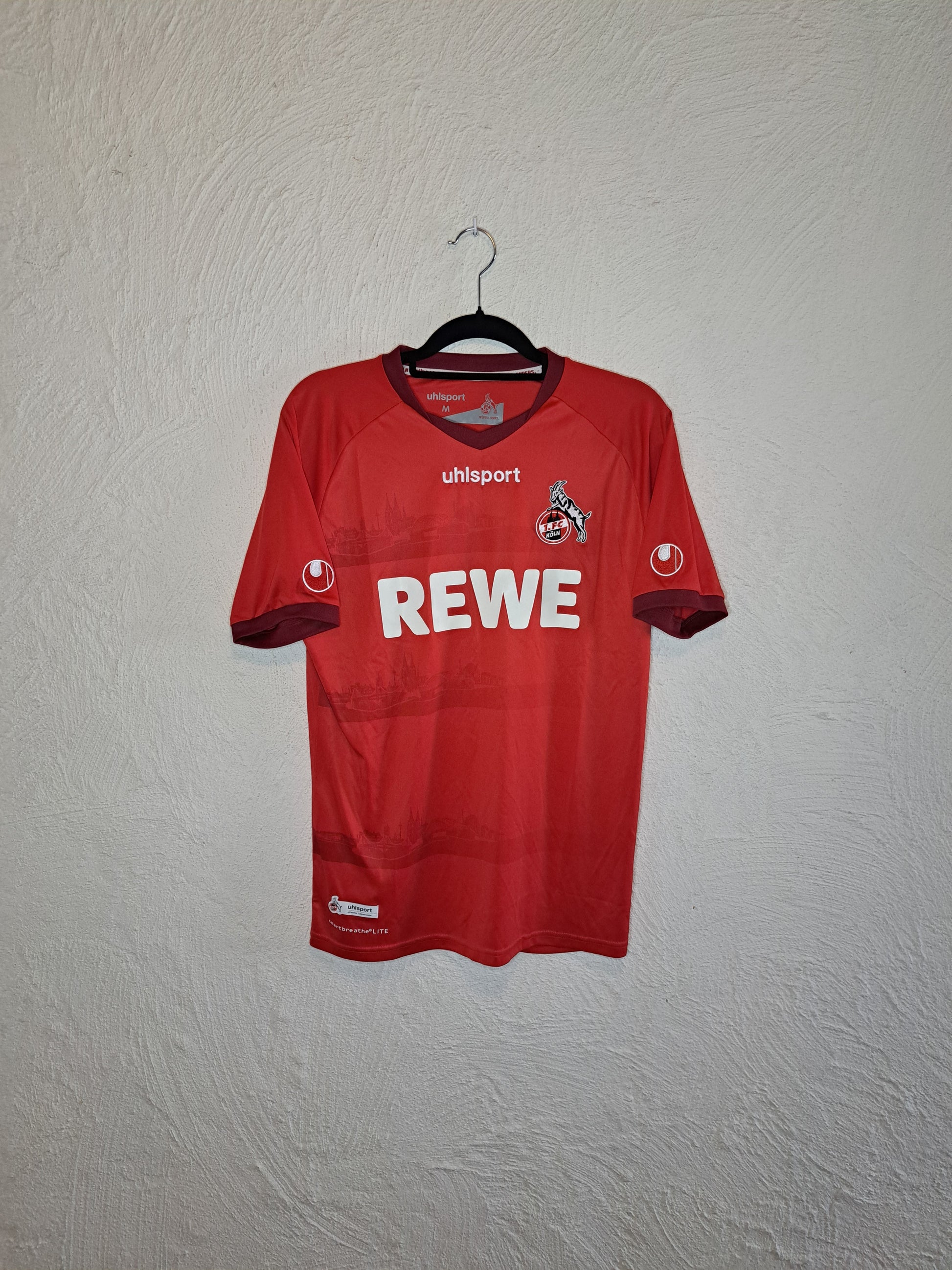 Classic 1. FC Köln design featuring a bold red base with white accents. The shirt is highlighted by the prominent REWE sponsor logo on the chest, delivering a clean and striking look. Subtle detailing and the embroidered club crest complete this authentic kit, perfectly representing Köln’s identity during the 2020-2021 season.