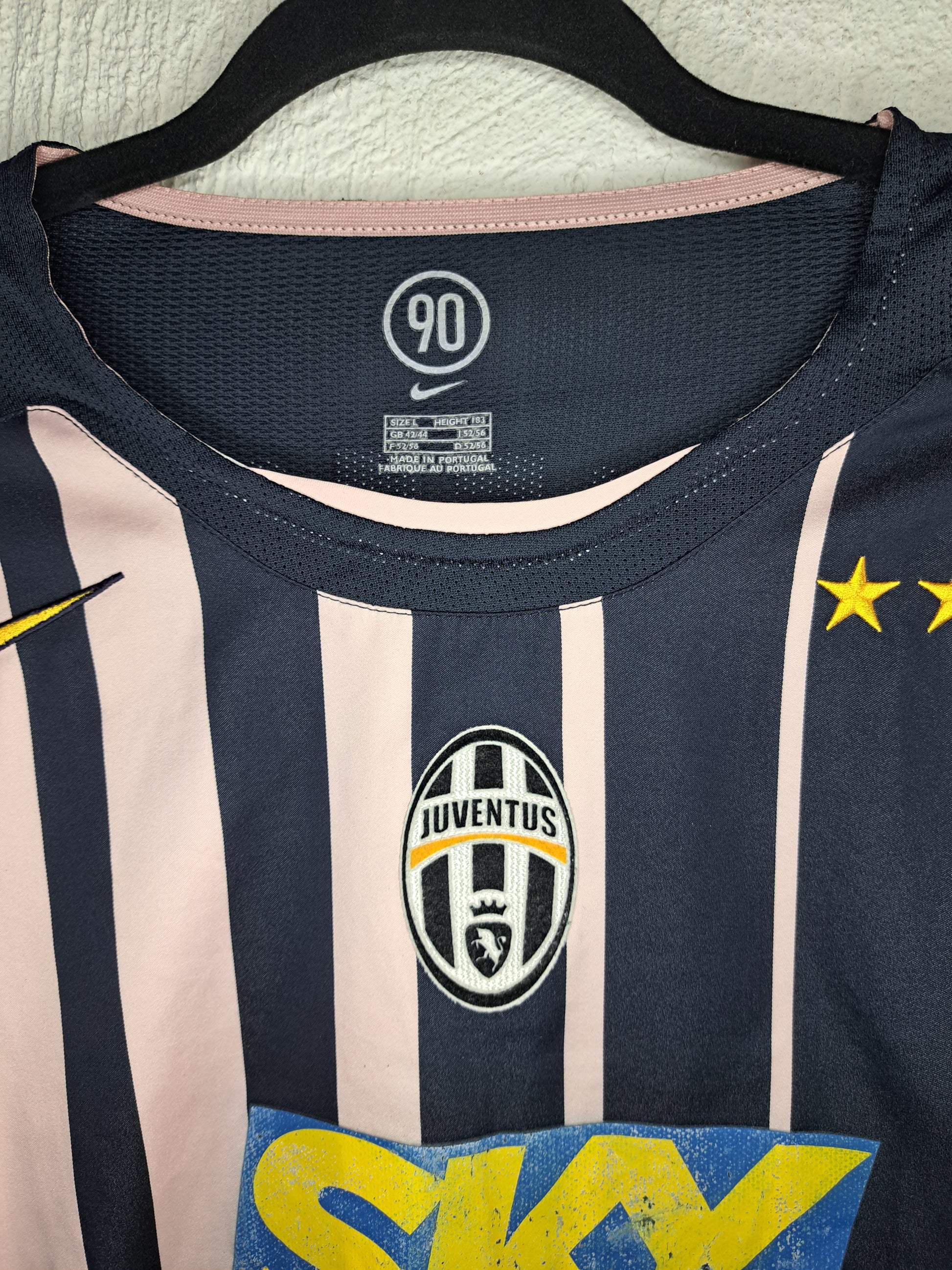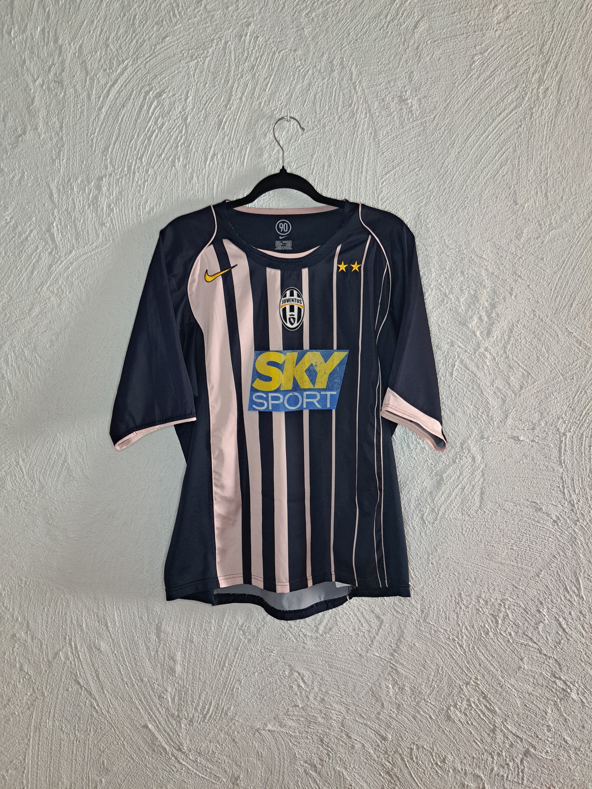 One of the boldest away kits in Juventus history, the 2004-2005 away shirt broke tradition with a daring navy and pale pink striped design. Made by Nike during their iconic “Total 90” era, the kit is instantly recognizable by its vertical stripes, minimalist collar, and vivid SKY Sport sponsor on the chest. The two gold stars above the club crest proudly celebrate Juve’s dominance in Italian football.