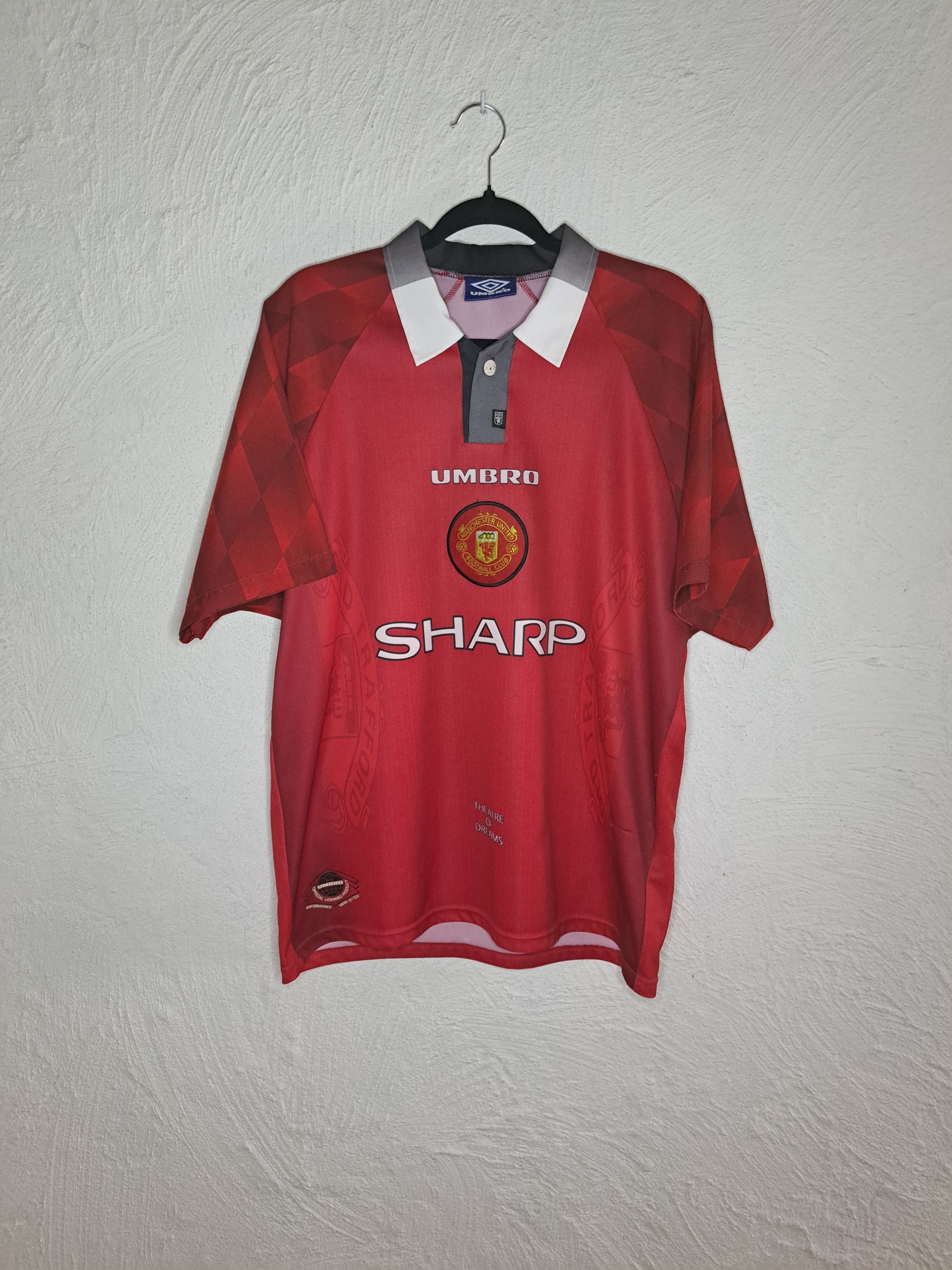 The design features the classic red base with a subtle shadow pattern inspired by Old Trafford’s architecture, adding depth to the shirt. The black collar with white and red trim gives it a sharp, vintage look, while the lace-up neckline, one of the last of its kind in modern football, adds a retro touch. The Sharp sponsor logo sits boldly across the chest, cementing its status as one of the most memorable kits of the 1990s.