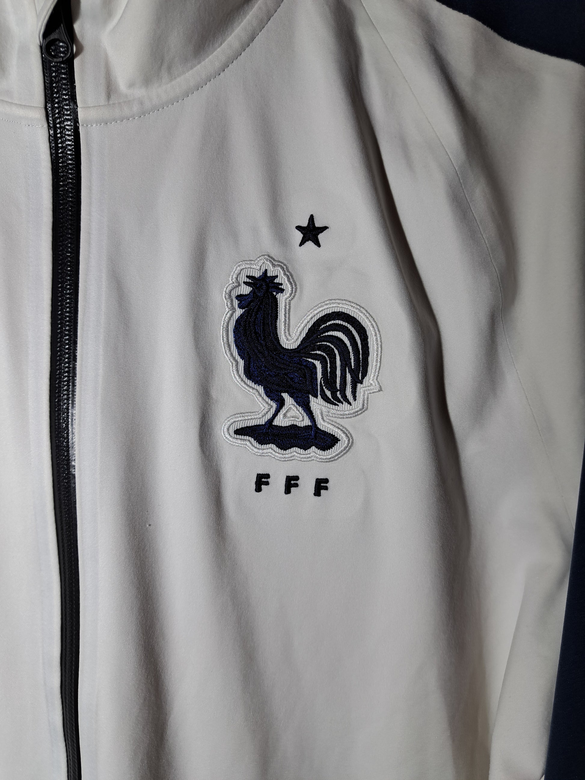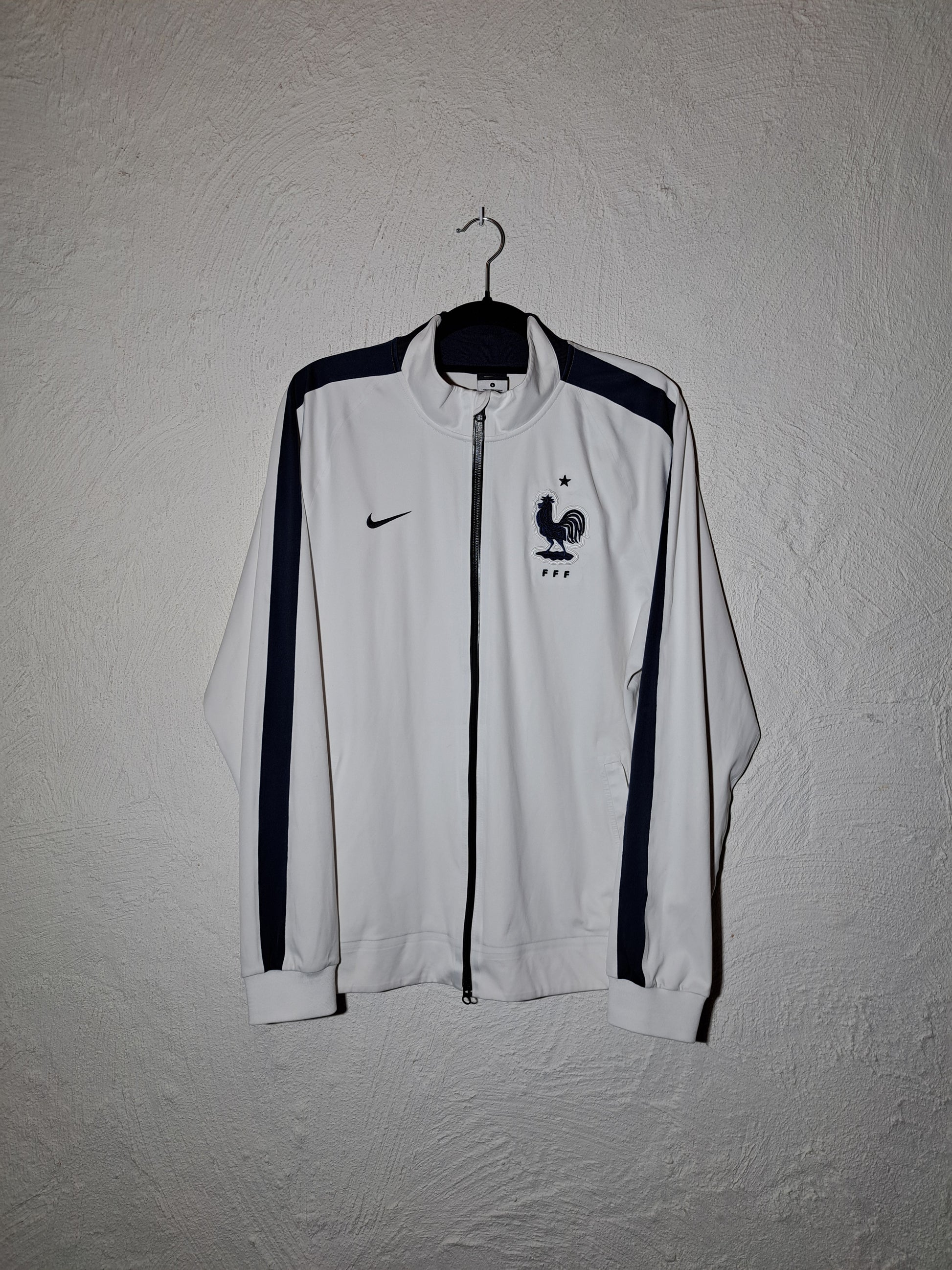 France Nike track jacket from the 2015-2016 season, clean white design with navy details and the proud rooster crest. A stylish piece from the era leading up to their Euro 2016 campaign.
