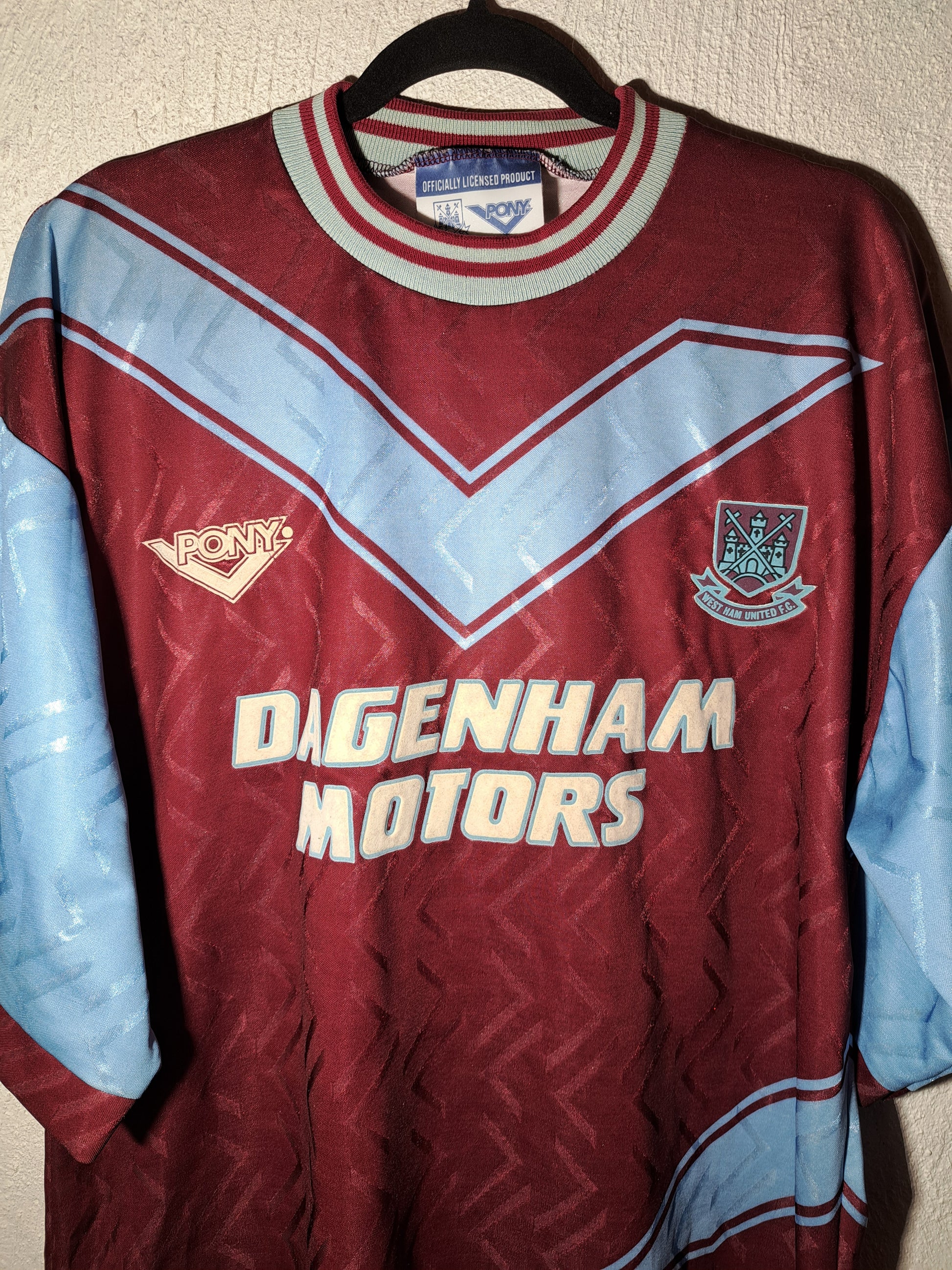 West Ham United home shirt from the 1993-1995 seasons, classic claret body with blue sleeves, made by Pony and sponsored by Dagenham Motors. A proper mid-90s Upton Park classic, full of old-school Premier League character.