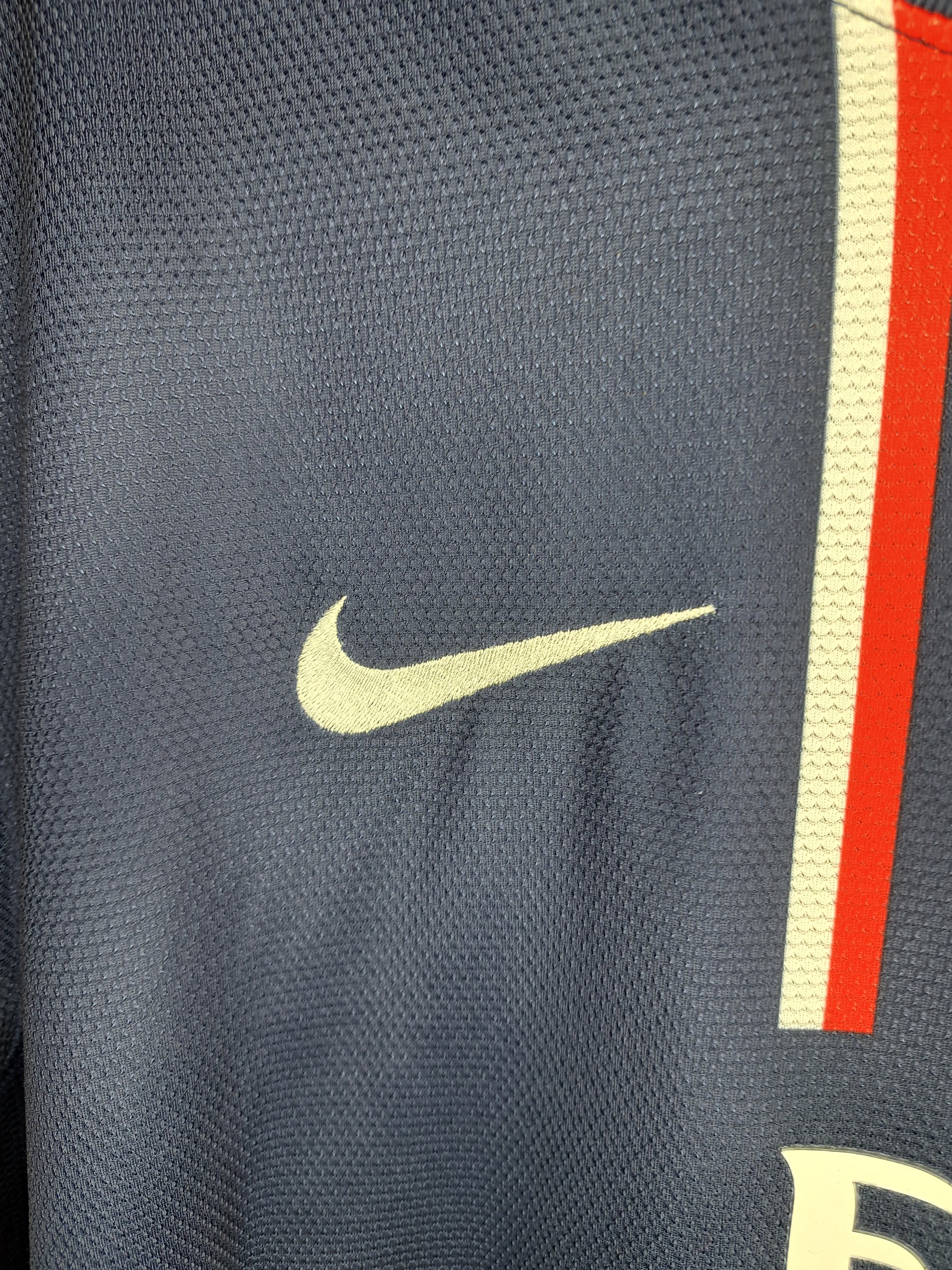PSG 2012-2013 home shirt by Nike. Navy blue with the iconic vertical red and white stripes and Fly Emirates sponsor. Worn during Zlatan Ibrahimović’s debut season, where he scored 30 league goals. Fun fact: this was the season PSG won their first Ligue 1 title in 19 years.