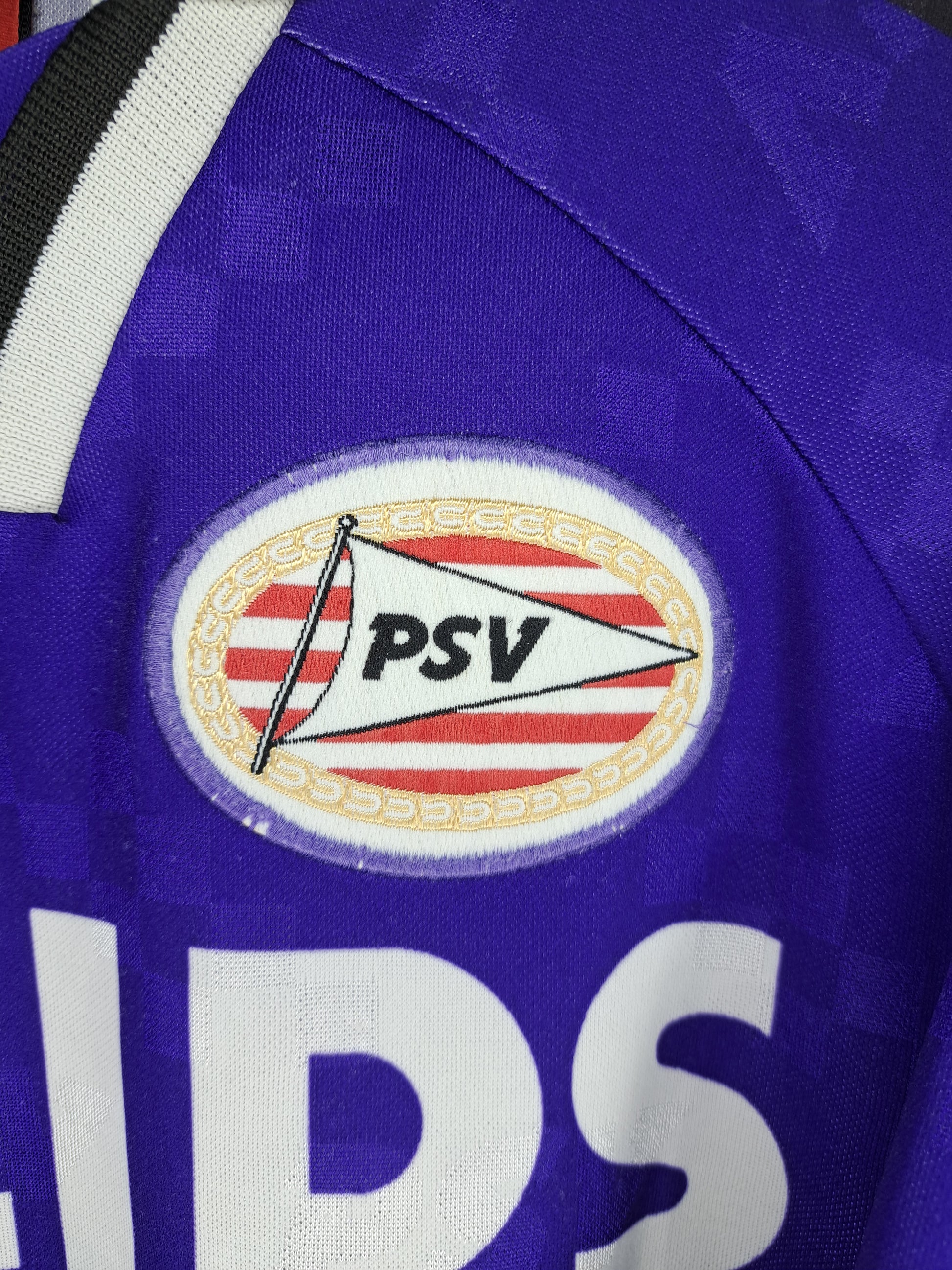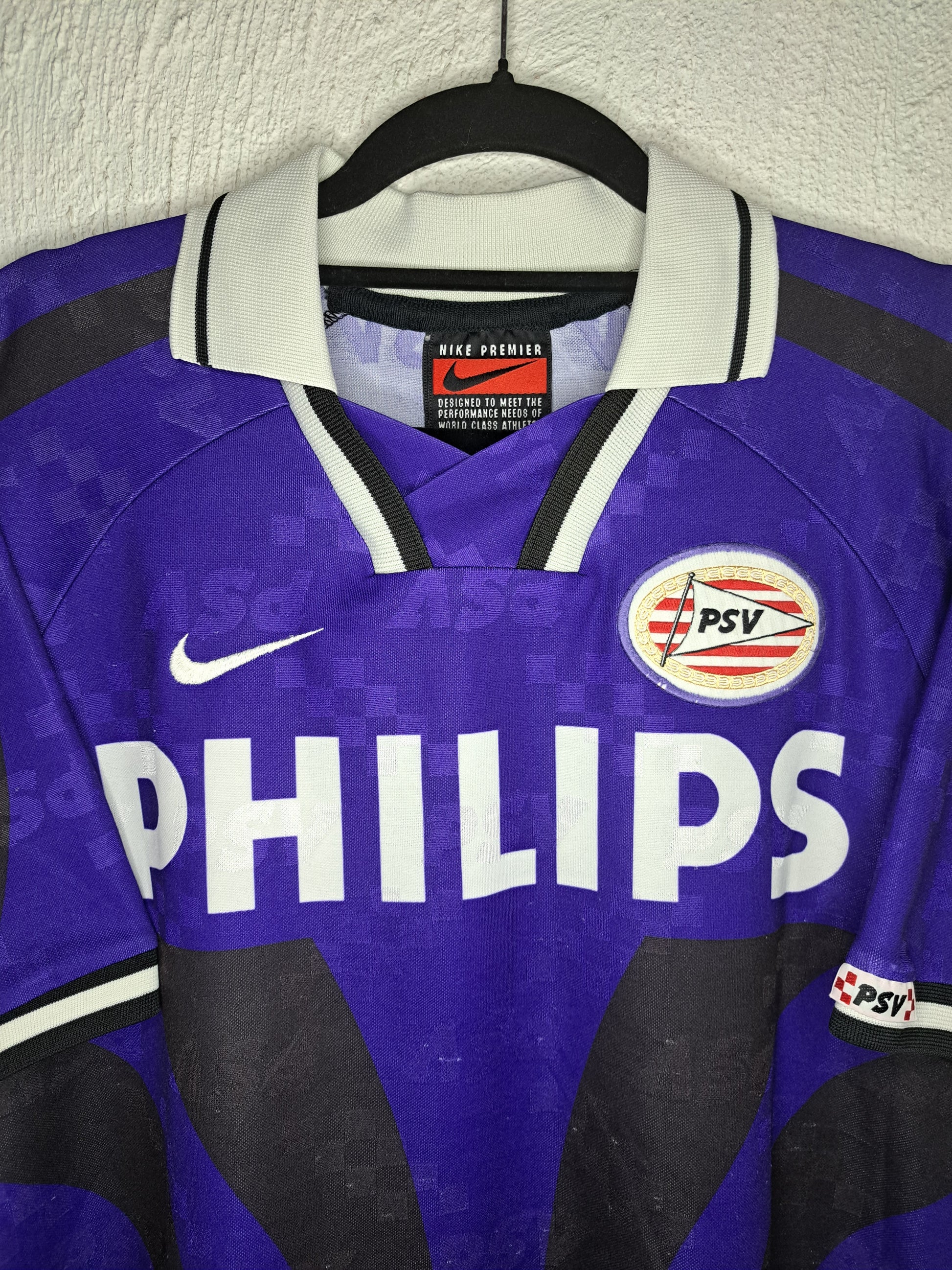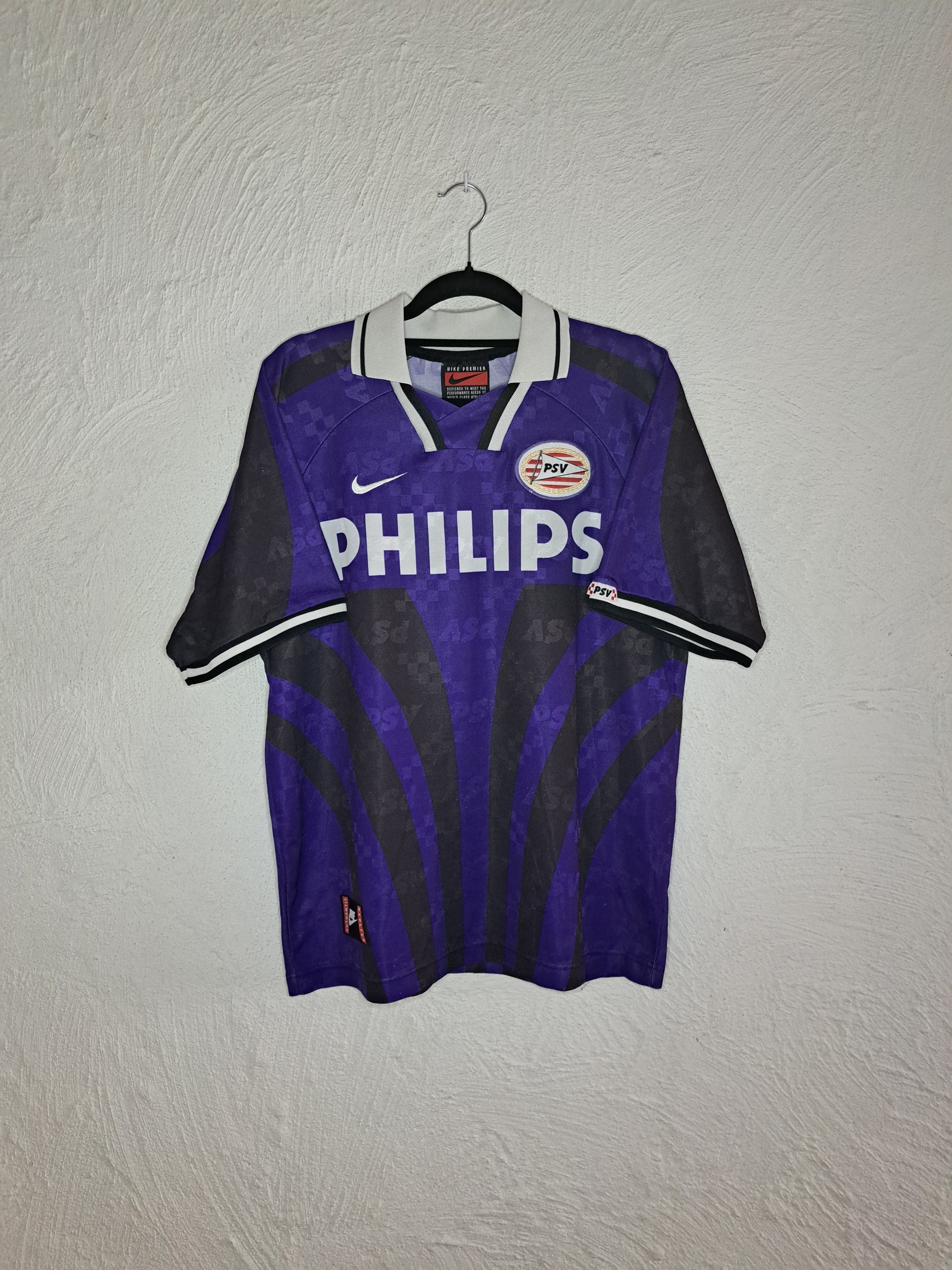 PSV away shirt from the 1996-1997 season, striking purple design by Nike with subtle graphic details and the classic Philips sponsor. A bold 90s look from the era of Luc Nilis and Cocu.