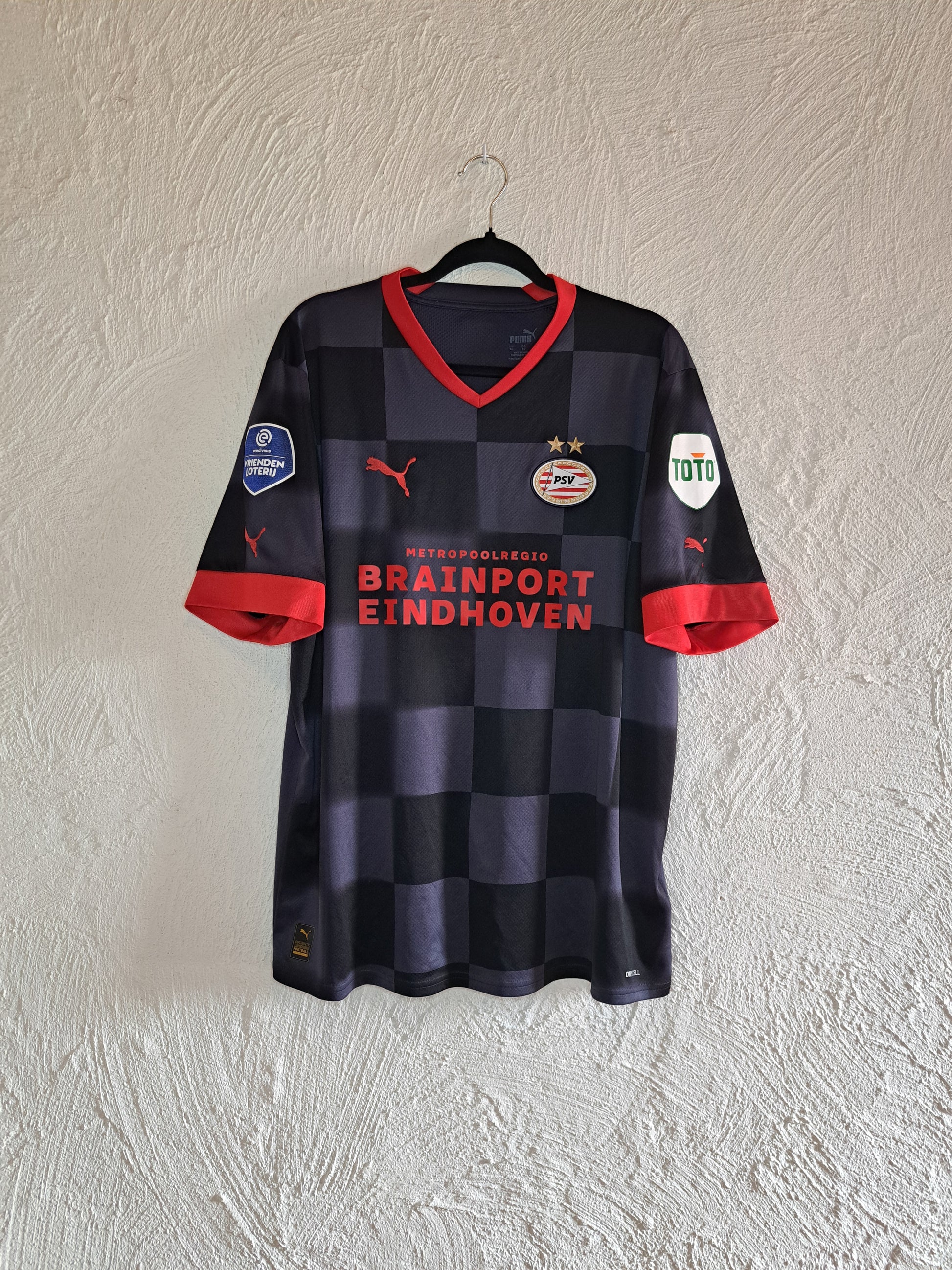 PSV 2022-2023 Home Shirt with bold checkered design. Modern twist on a classic look, reflecting the club’s dynamic spirit.