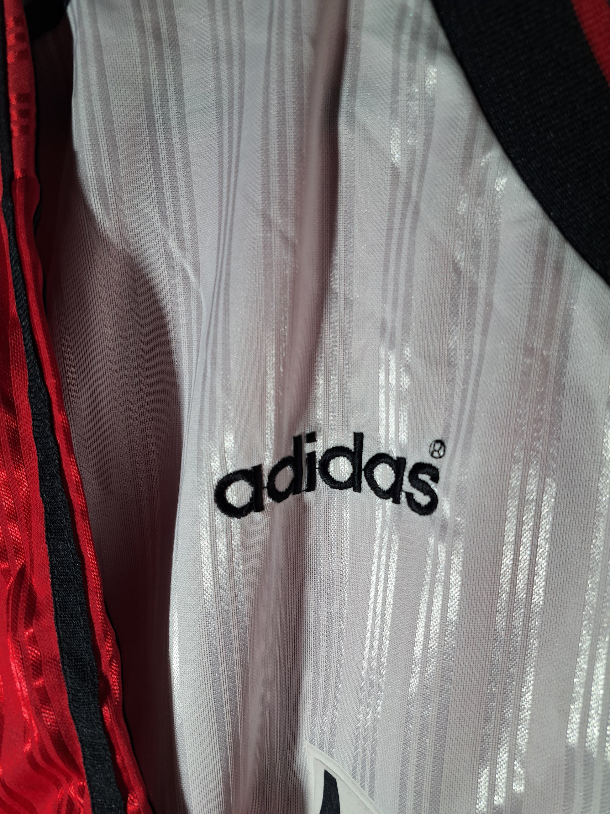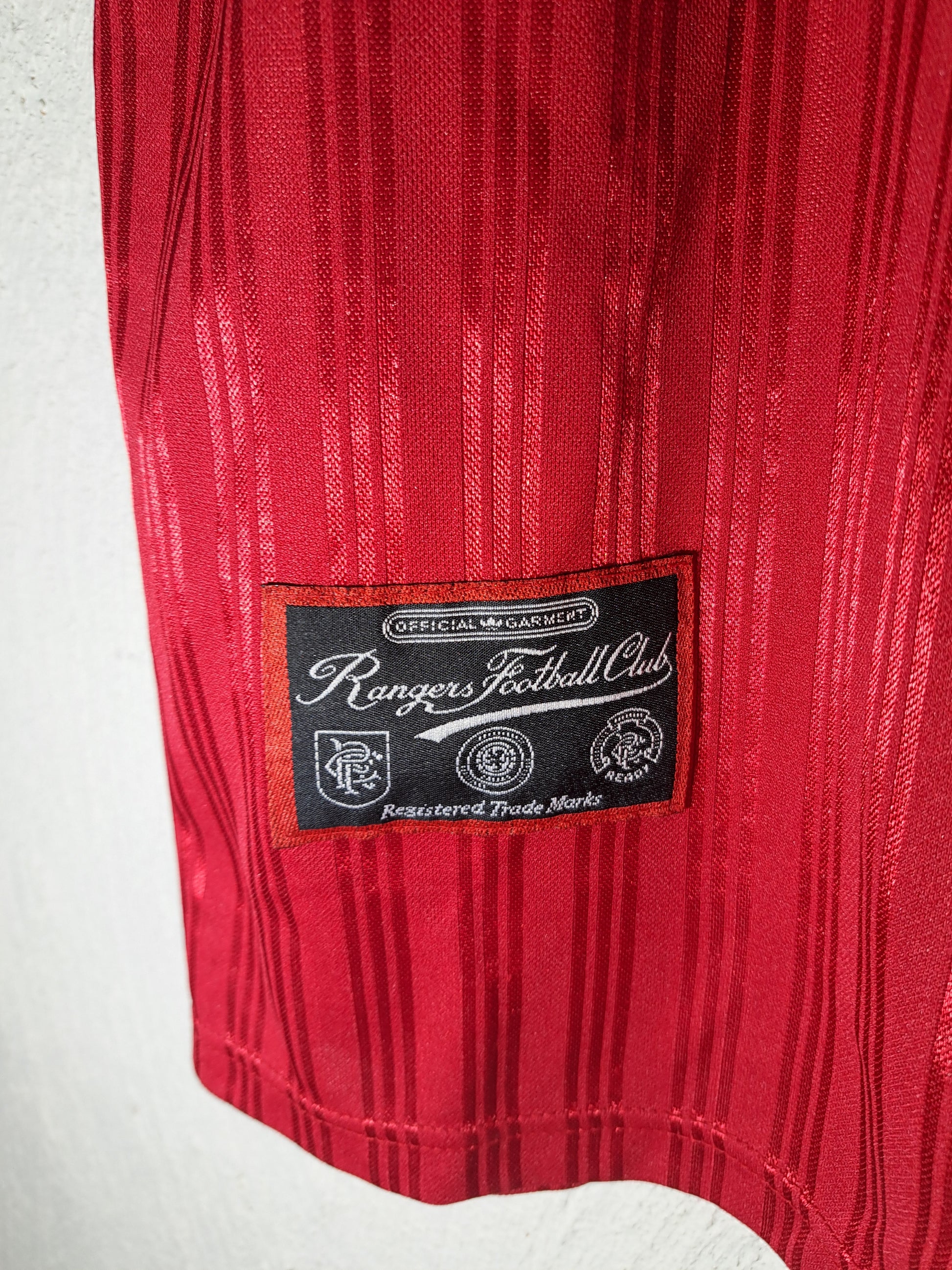 Rangers away shirt from the 1995-1996 season, bold white Adidas design with navy and red detailing and the classic McEwan’s Lager sponsor. A proper mid-90s Ibrox classic from the nine-in-a-row era.