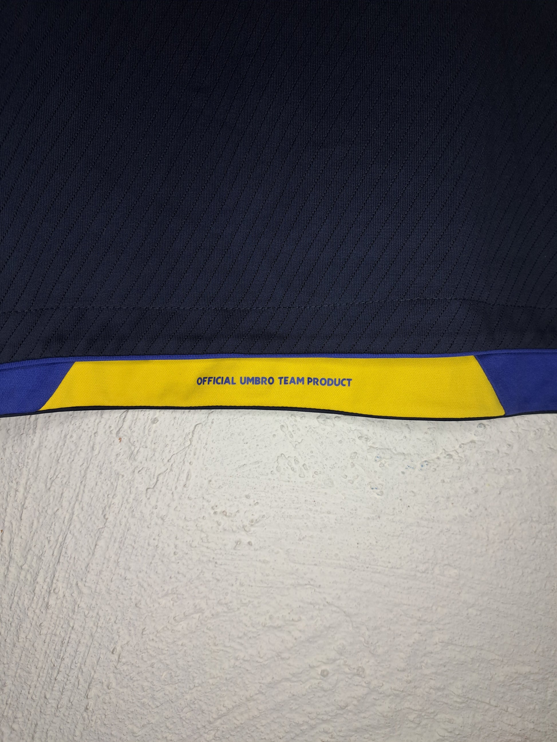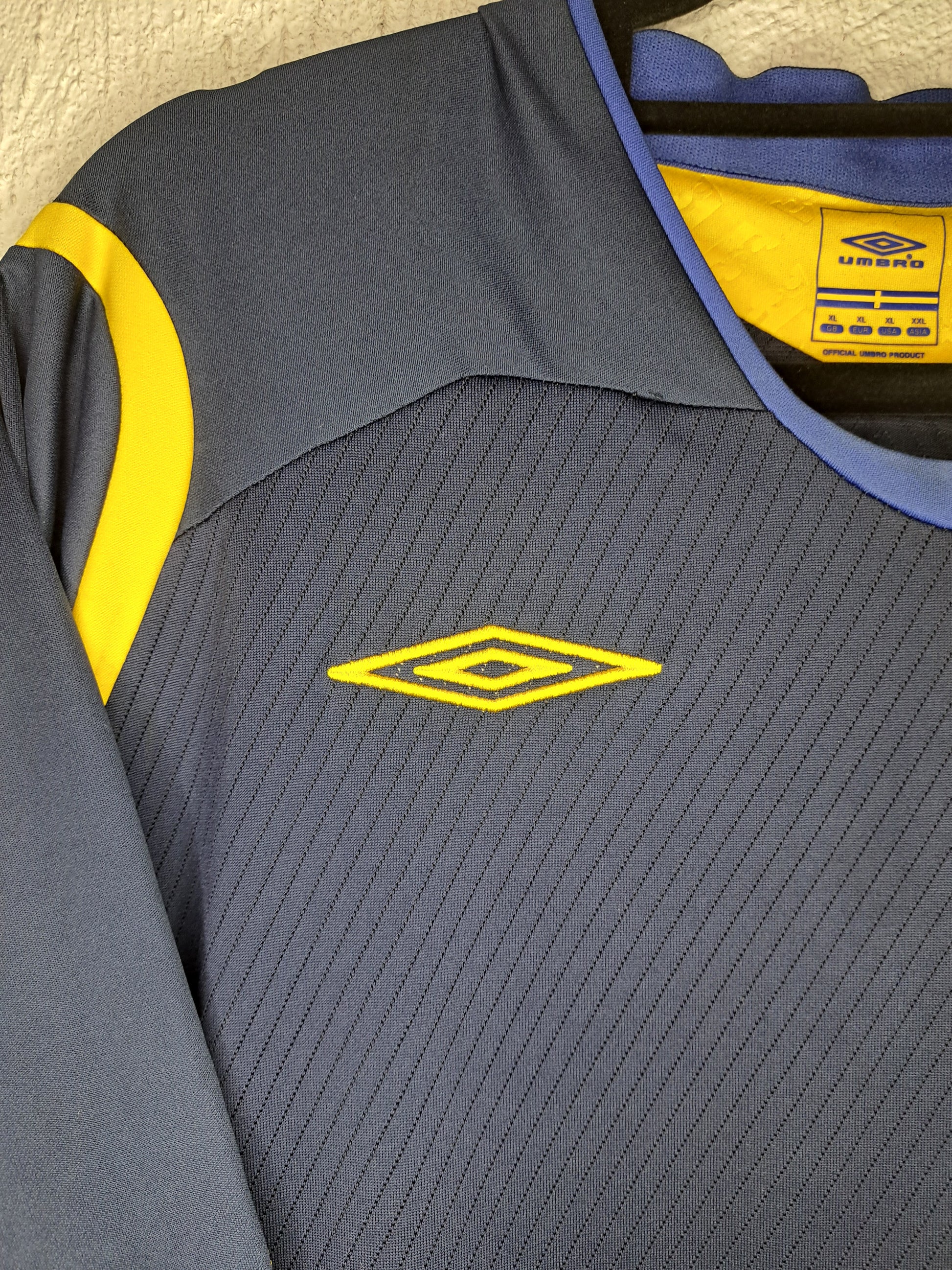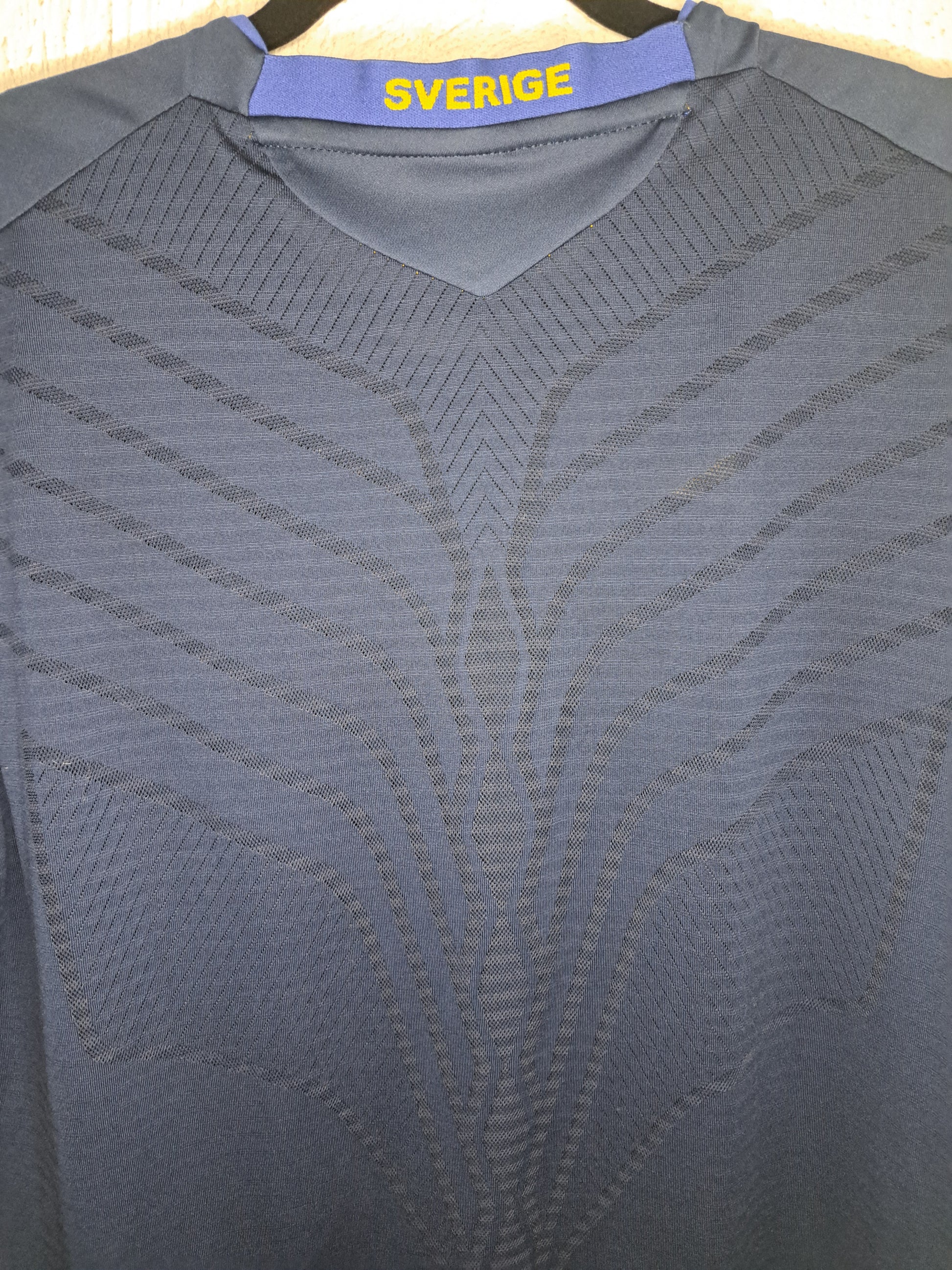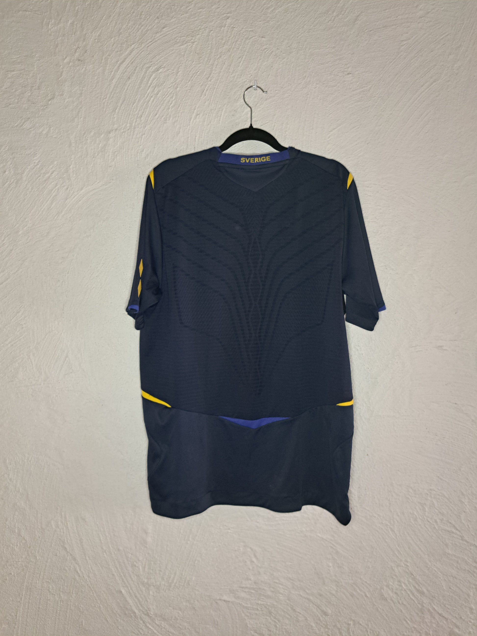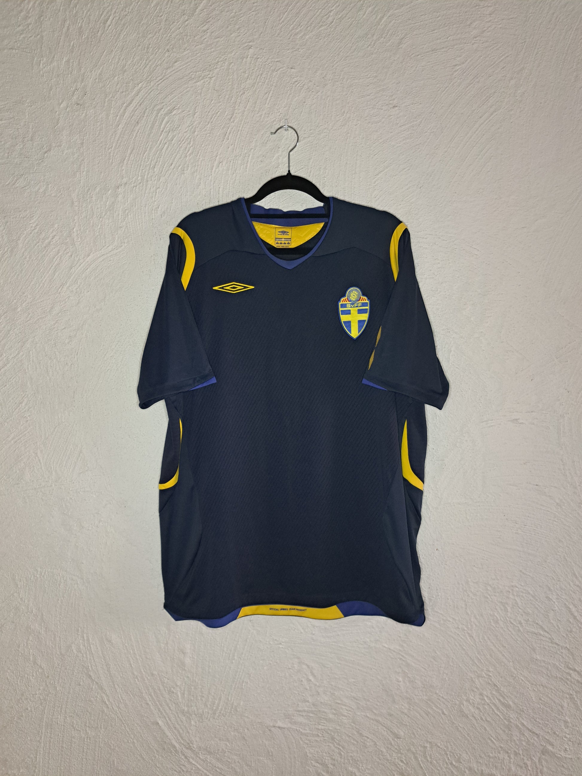 Sweden away shirt from the 2008-2010 seasons, sleek navy design with yellow trim, crafted by Umbro. A clean, confident look from the Zlatan era.